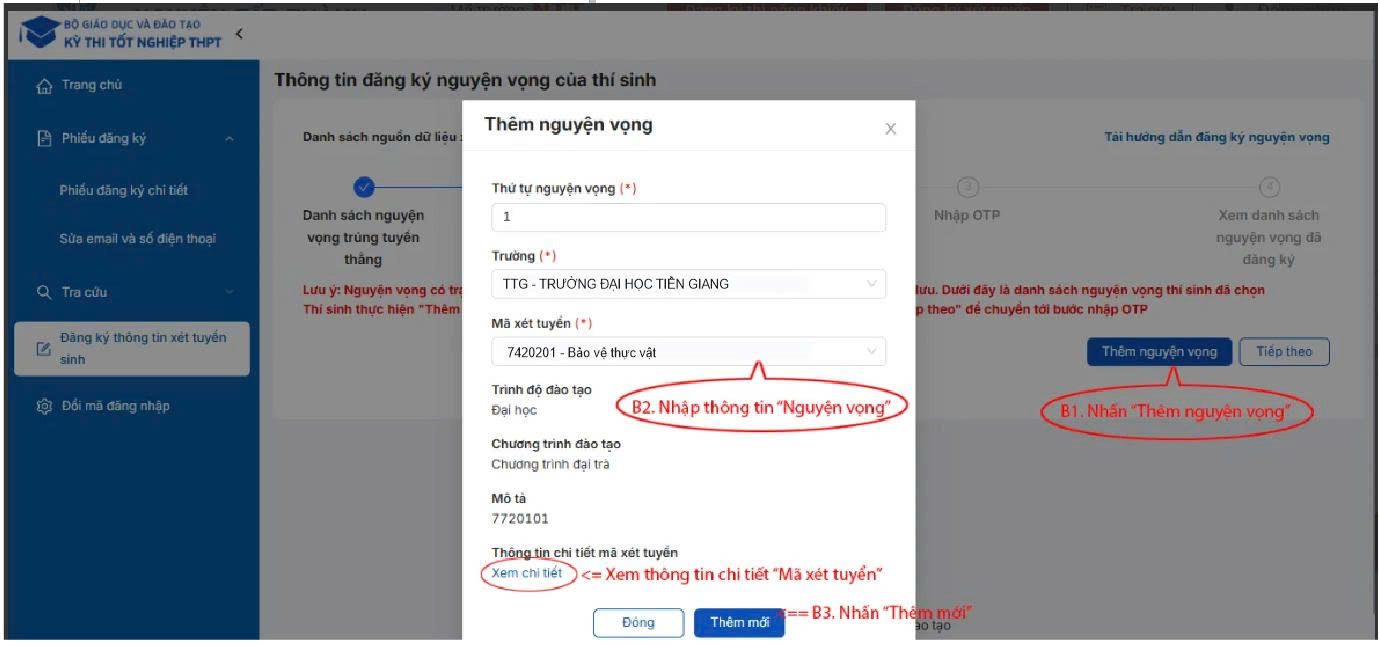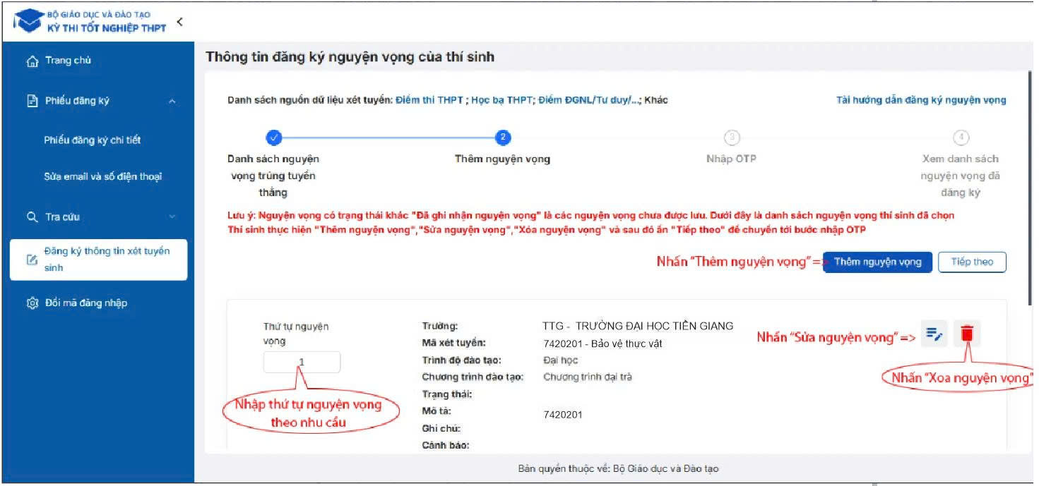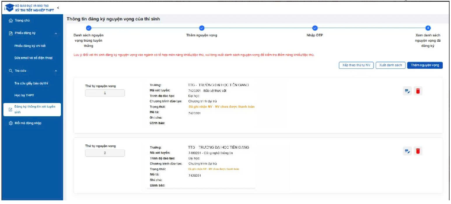 Sau khi kiểm tra các nguyện vọng đã được đăng ký:
