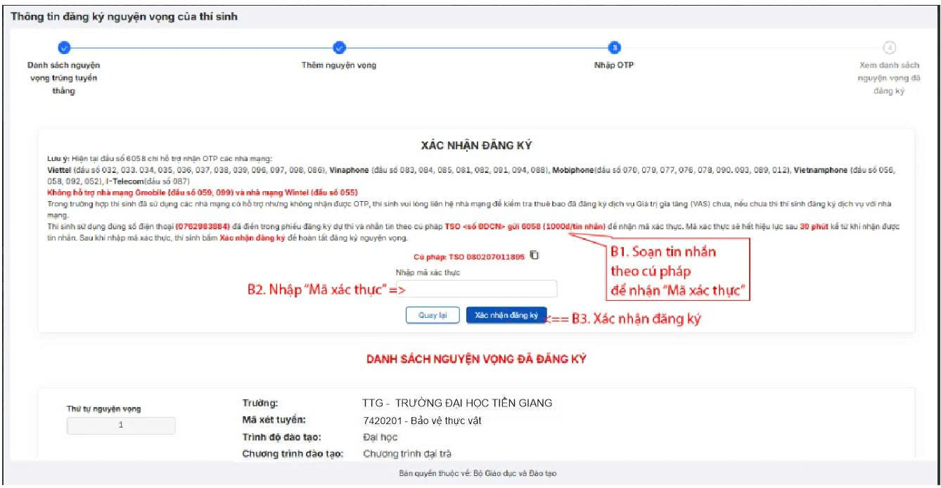5️⃣Bước 5: Tại "màn hình 3: Nhập OTP". Thí sinh dùng số điện thoại đã đăng ký trên hệ thống soạn tin nhắn theo cú pháp TSO gửi 6058 để lấy mã OTP. Sau đó nhập mã xác thực và nhấn nút Xác nhận đăng ký.