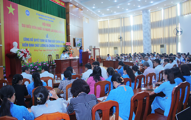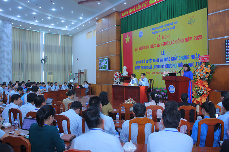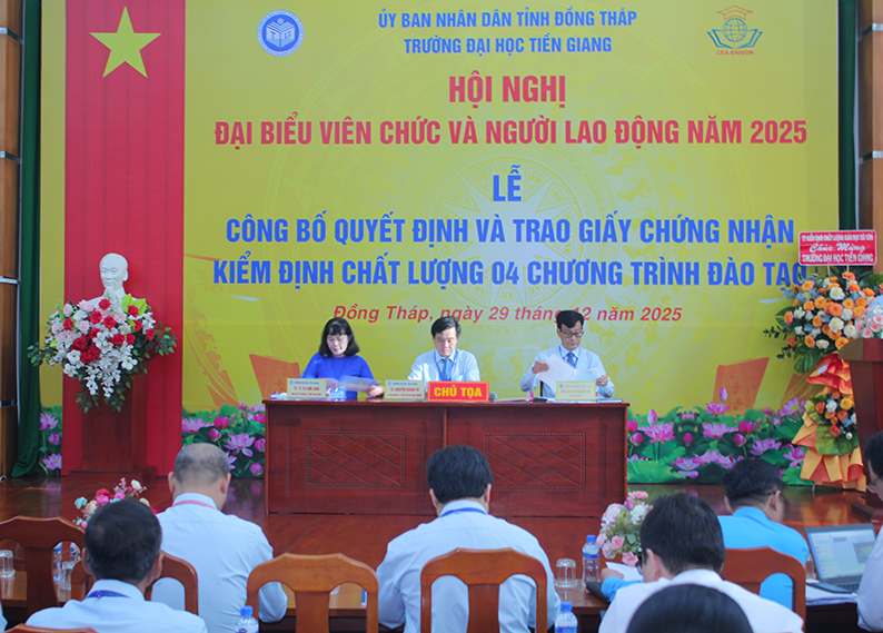 Ngày 29/12/2025, Trường Đại học Tiền Giang đã long trọng tổ chức Hội nghị đại biểu viên chức, người lao động năm học 2025–2026. Hội nghị là hoạt động thường niên quan trọng nhằm phát huy dân chủ cơ sở, đánh giá kết quả thực hiện nhiệm vụ năm học vừa qua và đề ra phương hướng, nhiệm vụ cho năm học mới.