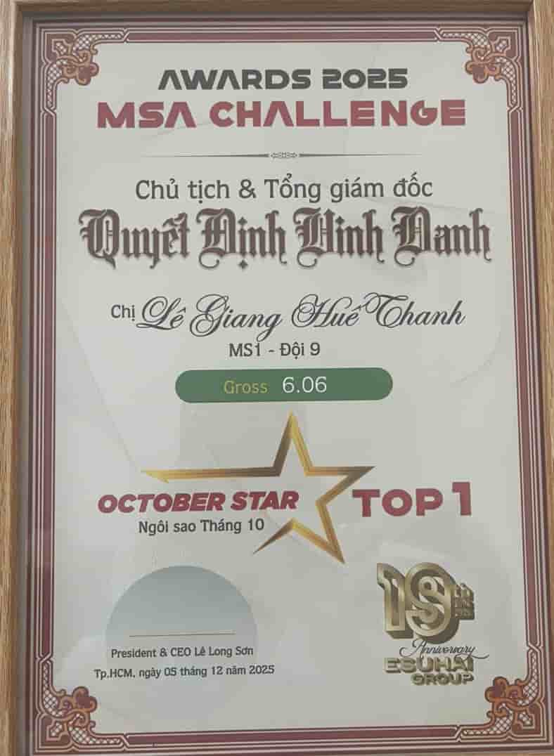 Ghi nhận những nỗ lực và đóng góp bền bỉ đó, vào tháng 12/2025, cô Lê Giang Huế Thanh đã vinh dự được Chủ tịch và Tổng Công ty TNHH ESUHAI trao tặng danh hiệu “Nhân viên xuất sắc của năm” – một phần thưởng xứng đáng cho tinh thần trách nhiệm, sự tận tụy và hiệu quả công việc trong suốt quá trình công tác.