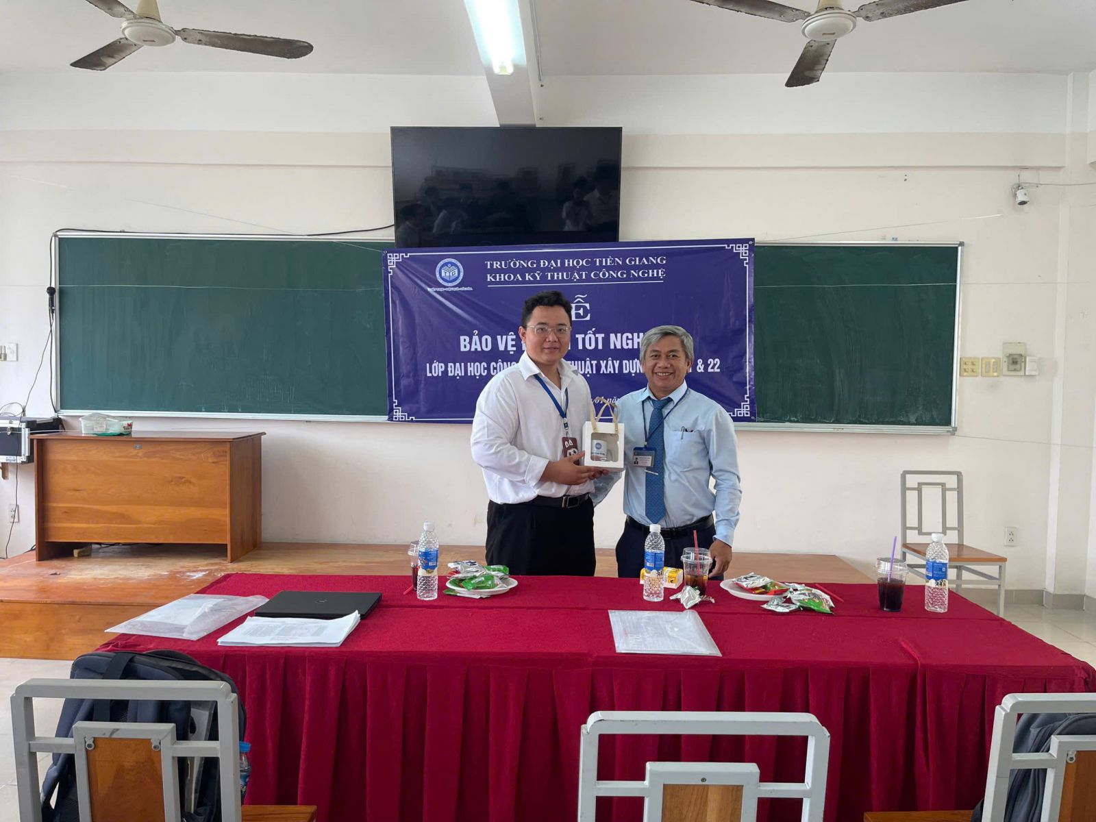 Thầy Huỳnh Quốc Bình - Phó Trưởng bộ môn Kỹ thuật Xây dựng tặng quà chúc mừng sinh viên có kết quả bảo vệ cao nhất Hội đồng.