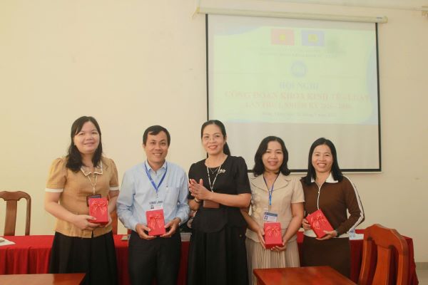 Bí thư Chi bộ 10 - Phó Trưởng khoa phụ trách khoa tặng quà lưu niệm cho BCH Tổ Công đoàn Khoa Kinh tế - Luật nhiệm kỳ cũ
