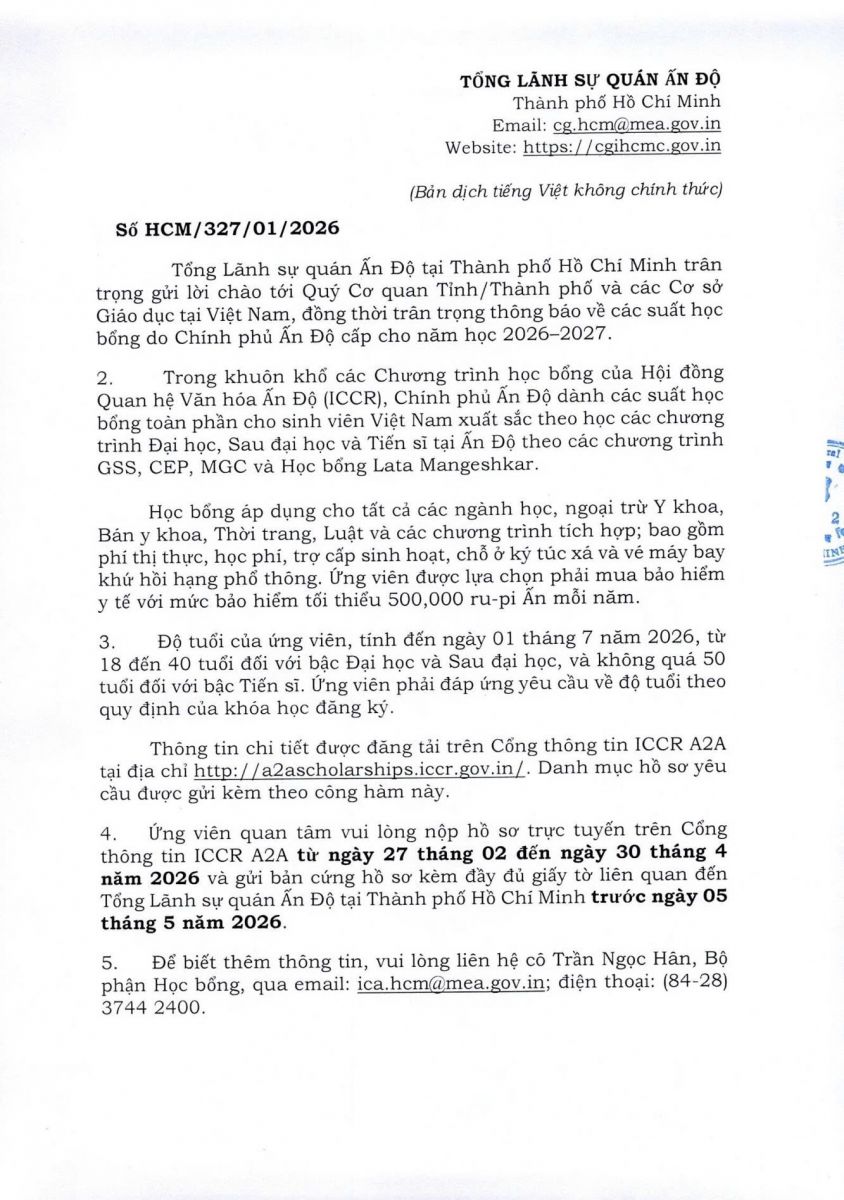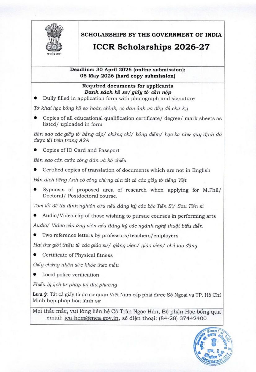 học bổng toàn phần ICCR; học bổng Ấn Độ; học bổng sau đại học và tiến sĩ;