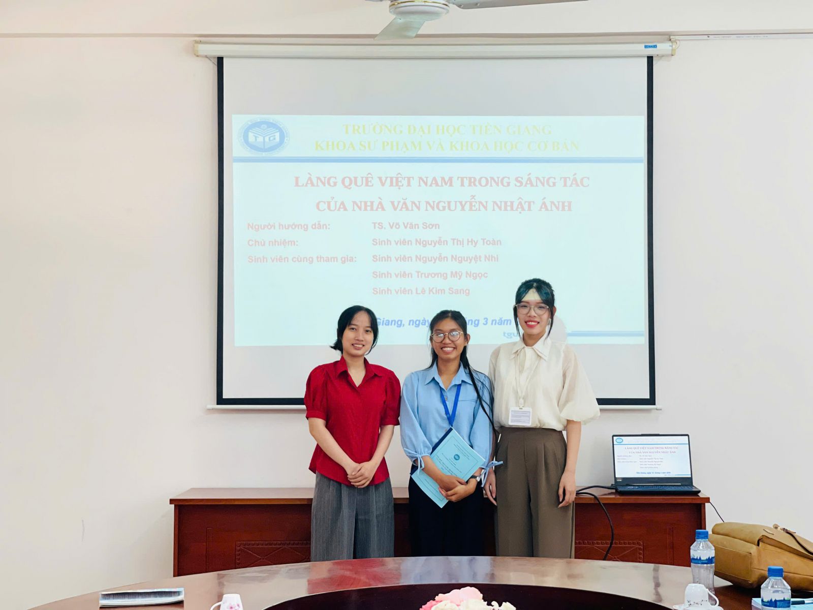 Thành viên tham gia hội đồng đánh giá kết quả gồm: Tiến sĩ Nguyễn Giang Lam (Phó Trưởng khoa Khoa Sư phạm và Khoa học cơ bản) – Chủ tịch Hội đồng cùng các thành viên: Thạc sĩ Trương Hoàng Vinh, Thạc sĩ Hồ Lưu Phúc, Thạc sĩ Mai Đức Long (Giảng viên Khoa Sư phạm và Khoa học cơ bản) và Thạc sĩ Lê Thị Hồng Vân (Giảng viên Phòng Quản lý Khoa học Công nghệ và Hợp tác quốc tế). Sau khi nghe nhóm nghiên cứu trình bày và thảo luận, Hội đồng thống nhất nghiệm thu đề tài và khuyến khích sinh viên ngành Ngữ văn, Văn hóa học tiếp tục phát triển các hoạt động nghiên cứu khoa học trong thời gian tới.