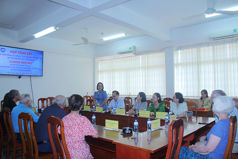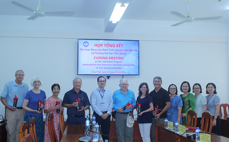 Chiều ngày 31/10/2025, Trường Đại học Tiền Giang tổ chức Họp tổng kết chương trình tại Phòng B.243. Dự buổi họp có ông Cao Nguyên Thi – Phó Hiệu trưởng, ông Bùi Quang Thịnh – Phó Trưởng phòng phụ trách Phòng Quản lý khoa học công nghệ và Hợp tác quốc tế, ông Phạm Quốc Thịnh – Phó Trưởng phòng Quản lý khoa học công nghệ và Hợp tác quốc tế, đại diện lãnh đạo Khoa Sư phạm và Khoa học cơ bản, bà Bùi Thị Nhật Tuyền – Phó Trưởng Bộ môn phụ trách Bộ môn Ngoại ngữ, cùng các giảng viên Bộ môn Ngoại ngữ và toàn thể đoàn tình nguyện viên Hoa Kỳ.