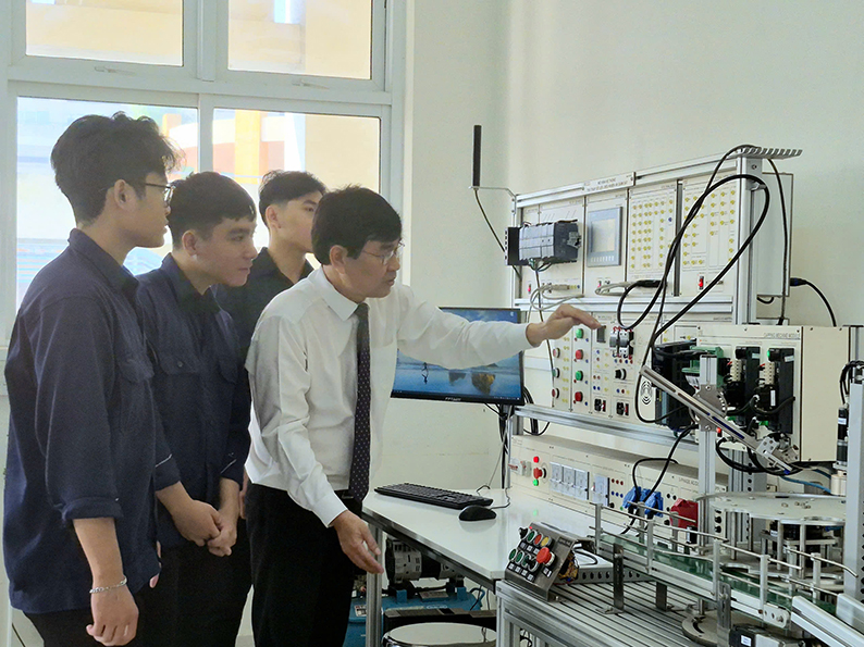 Sinh viên ngành Cơ - Điện tử trong giờ học thực hành vận hành mô hình đóng nút chai dưới sự hướng dẫn của Tiến sĩ Dương Ngọc Hùng.