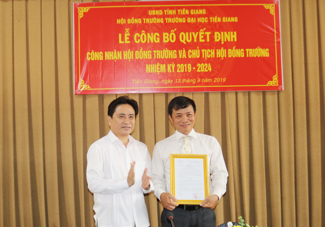 Ngày 13/9, Trường ĐH Tiền Giang đã trang trọng tổ chức công bố quyết định 2758/QĐ-UBND của Chủ tịch UBND tỉnh Tiền Giang về việc công nhận Chủ tịch Hội đồng trường Trường ĐH Tiền Giang khóa III, nhiệm kỳ 2019-2024 đối với TS. Nguyễn Viết Thịnh (Nguyên là Trưởng khoa Sư phạm của Trường) và quyết định 2757/QĐ-UBND về việc công nhận Hội đồng trường Trường ĐH Tiền Giang.