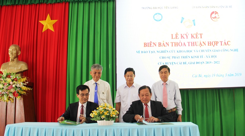 Chiều ngày 19/3/2019, Trường Đại học Tiền Giang đã tổ chức lễ ký kết thỏa thuận hợp tác với UBND huyện Cái Bè về đào tạo, nghiên cứu khoa học và chuyển giao công nghệ và đào tạo nguồn nhân lực giai đoạn 2019 - 2022. Tham dự lễ ký kết có đồng chí Trần Thanh Nguyên - Bí thư Huyện ủy Cái Bè; đồng chí Nguyễn Quốc Thanh - Chủ tịch UBND huyện Cái Bè; PGS.TS. Võ Ngọc Hà - Bí thư Đảng ủy, Hiệu trưởng Trường Đại học Tiền Giang; TS. Lê Hữu Hải - Phó Hiệu trưởng Trường Đại học Tiền Giang, cùng đại diện lãnh đạo các đơn vị trực thuộc của huyện và Trường.