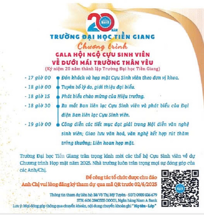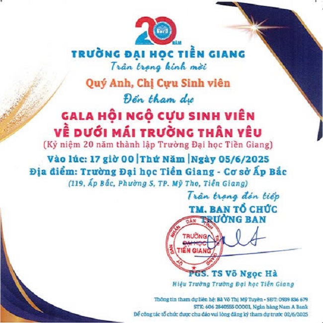 Thư mời; cựu sinh viên; tham gia 20 năm; chương trình 20 năm; cựu sinh viên; Trường Đại học Tiền Giang;