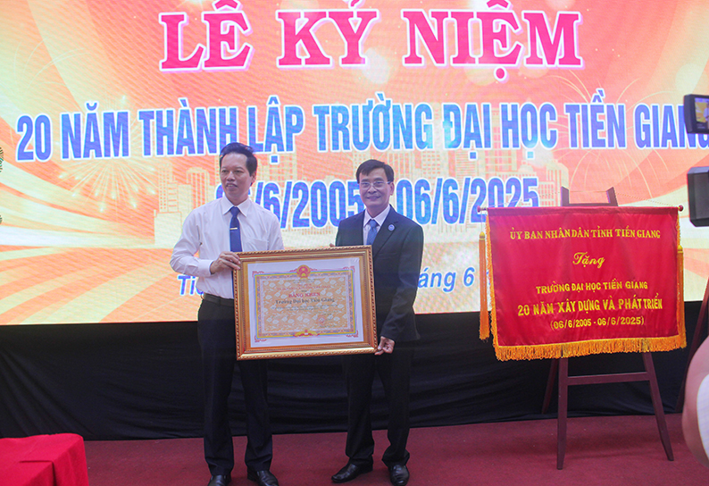 Ông Nguyễn Thành Diệu – Tỉnh ủy viên, Phó Chủ tịch UBND tỉnh Tiền Giang tặng Bằng khen của Chủ tịch UBND tỉnh Tiền Giang cho Trường Đại học Tiền Giang.