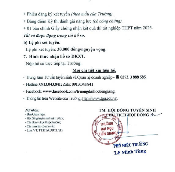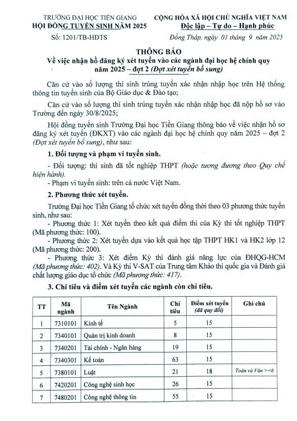 Hội đồng tuyển sinh Trường Đại học Tiền Giang thông báo về việc nhận hồ sơ đăng ký xét tuyển (ĐKXT) vào các ngành đại học hệ chính quy năm 2025 – đợt 2 (Đợt xét tuyển bổ sung) với tổng 292 chỉ tiêu, cụ thể như sau: