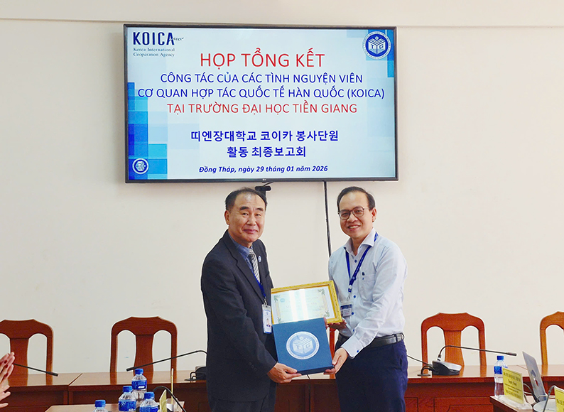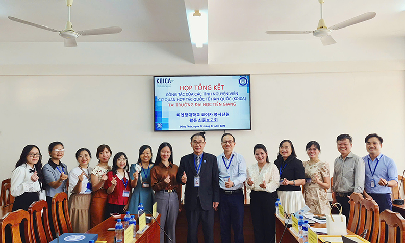 Sáng ngày 29/01/2026, Trường Đại học Tiền Giang đã tổ chức Họp tổng kết công tác tình nguyện của hai tình nguyện viên (TNV) thuộc Cơ quan Hợp tác quốc tế Hàn Quốc – KOICA gồm ông Lee Song Mo và bà Kim JeongShin, sau gần hai năm công tác tại trường.