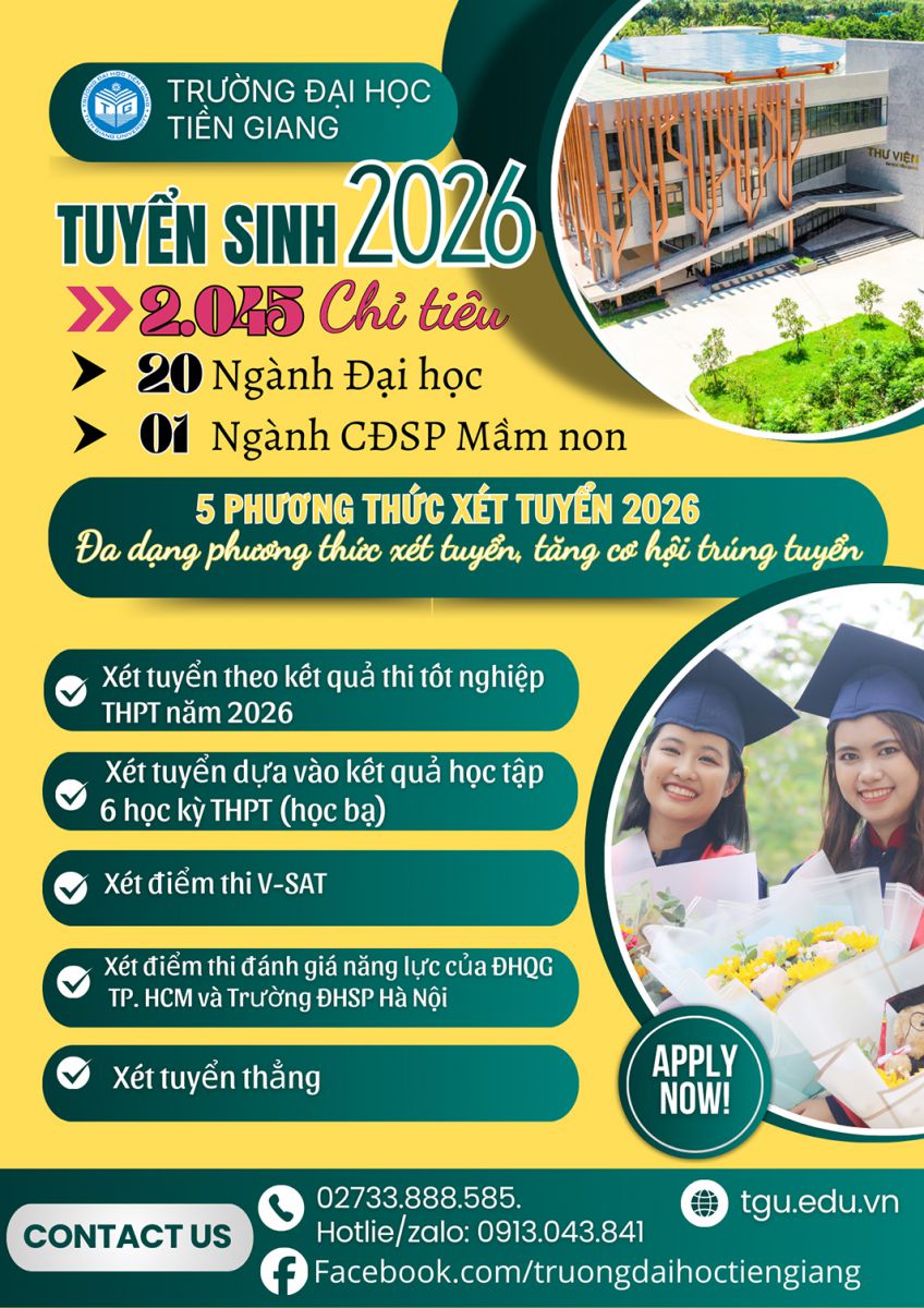Năm 2026, Trường Đại học Tiền Giang tuyển sinh 2.045 chỉ tiêu cho 20 ngành ở hệ đại học và 1 ngành CĐ Giáo dục Mầm non. Trường triển khai 05 phương thức xét tuyển, tạo điều kiện thuận lợi để thí sinh lựa chọn hình thức phù hợp với năng lực và điều kiện học tập của mình.