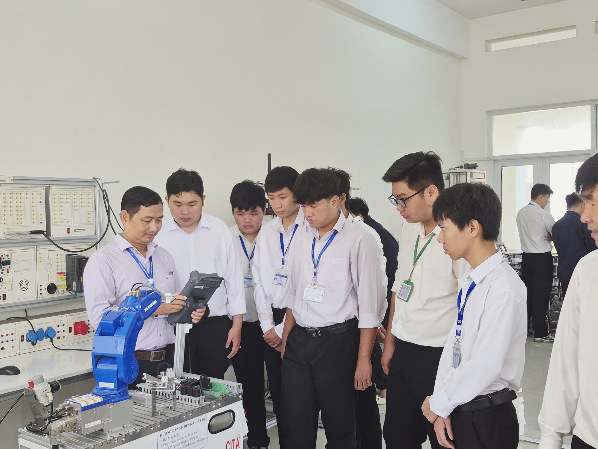 Sinh viên ngành Cơ - Điện tử của trường trong giờ học thực hành với Tiến sĩ Dương Ngọc Hùng - Ảnh: LÊ TÂN