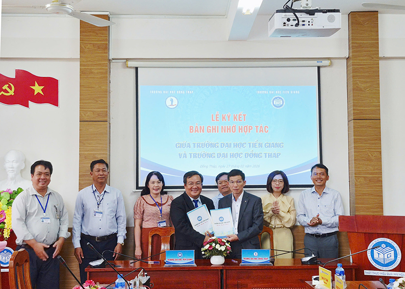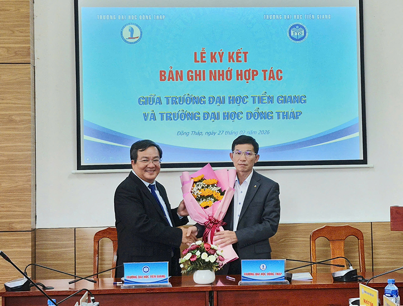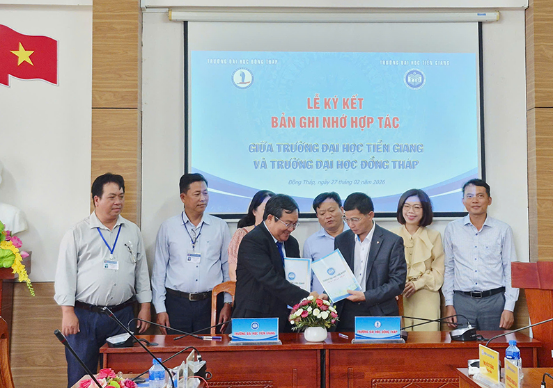 Chiều ngày 27/02/2026, tại Trường Đại học Tiền Giang đã diễn ra buổi làm việc và lễ ký kết Biên bản ghi nhớ hợp tác đào tạo, bồi dưỡng giữa Trường ĐH Tiền Giang và Trường ĐH Đồng Tháp. Chương trình nhằm tăng cường liên kết giữa các cơ sở giáo dục đại học trong bối cảnh đổi mới, tự chủ và hội nhập, qua đó phát huy thế mạnh của hai bên để nâng cao chất lượng đào tạo và phát triển nguồn nhân lực cho địa phương.