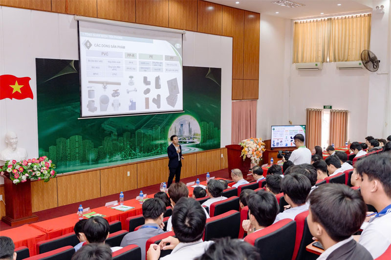 Trong khuôn khổ chương trình, Công ty CP Nhựa Thiếu niên Tiền Phong phía Nam mang đến buổi Workshop chuyên đề “Tiêu chuẩn công trình xanh và tác động đến lựa chọn vật liệu - yếu tố then chốt cho phát triển bền vững trong ngành xây dựng". Chủ đề vô cùng thiết thực và mang tính thời sự trong bối cảnh toàn cầu hướng đến phát triển xanh bền vững đã thu hút sự quan tâm của các bạn sinh viên. Nhiều sinh viên tham dự cũng đã nhận được những phần thưởng giá trị khi tham gia vào trò chơi Đố vui có thưởng của công ty.