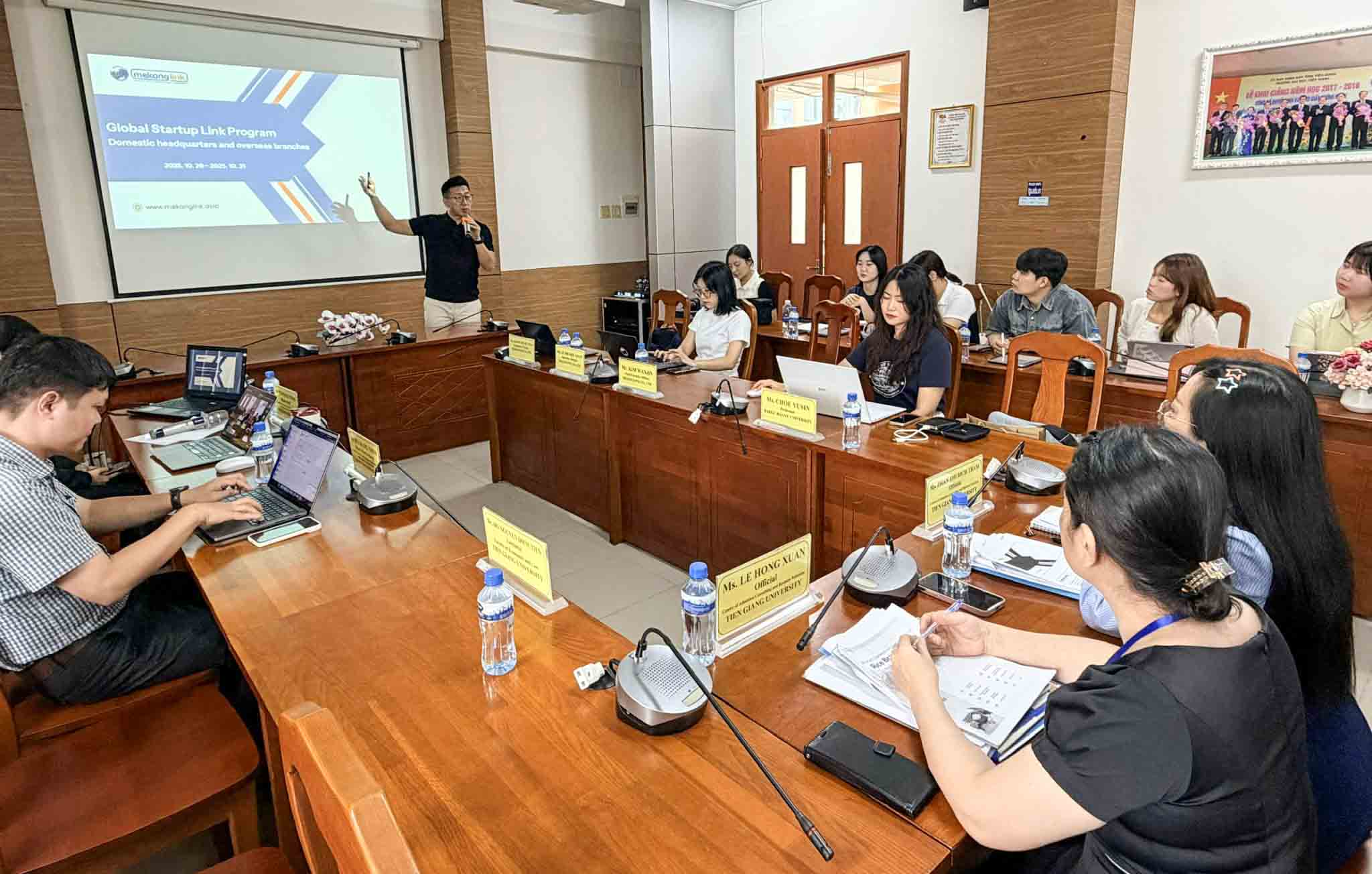 Sáng ngày 30/10/2025, tại Trường Đại học Tiền Giang, đã diễn ra Lễ khai mạc chương trình “Global Startup Link Program”, do Trường Đại học Tiền Giang phối hợp với Trường Đại học Daegu Haany, Hàn Quốc và Công ty TNHH Mekonglink đồng tổ chức. Chương trình được triển khai trong 02 ngày 30 và 31/10/2025, với mục tiêu thúc đẩy giao lưu học thuật, trao đổi văn hóa và phát triển ý tưởng khởi nghiệp giữa sinh viên hai nước Việt Nam - Hàn Quốc.