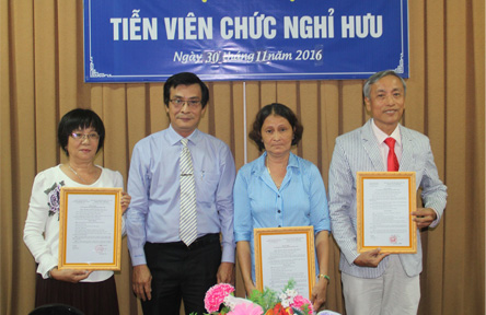 Ngày 30/11/2016, tại phòng họp B.14, Trường Đại học Tiền Giang đã long trọng tổ chức họp mặt tiễn thầy Huỳnh Thủy Chung - Giảng viên chính, Phó Trưởng phòng Tổ chức - Hành chánh, cô Nguyễn Thị Thu Hồng - Giảng viên khoa Sư phạm, cô Lâm Thị Thu, cô Phạm Kim Liên - Phòng Quản trị - Thiết bị nghỉ hưu theo chế độ.